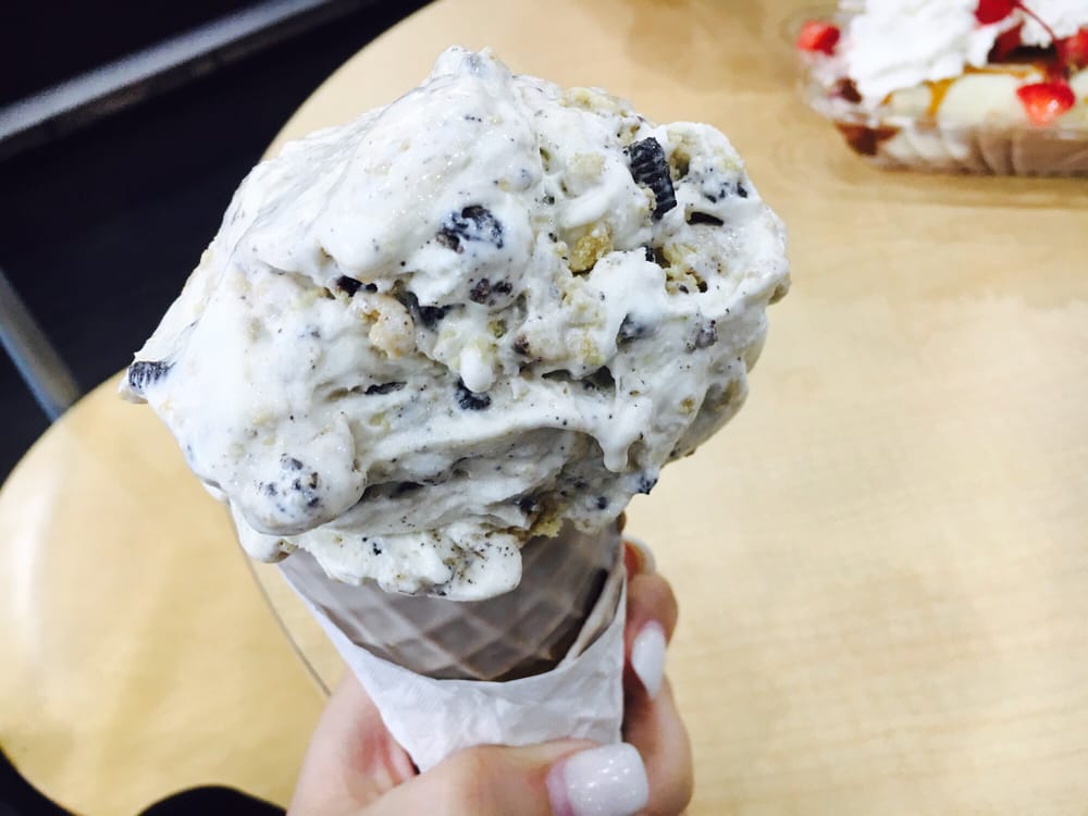 Sweet Cream Ice Cream, Oreo Cookie Pieces & Mallo Creme.