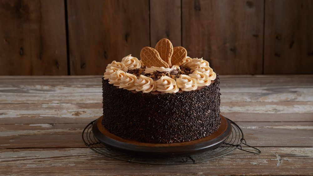 This rich, indulgent chocolate cake features two layers of Chocolate Ice Cream in between two layers of chocolate cake and is covered in Whipped Chocolate Crème Icing and then topped with Hershey’s Kisses."